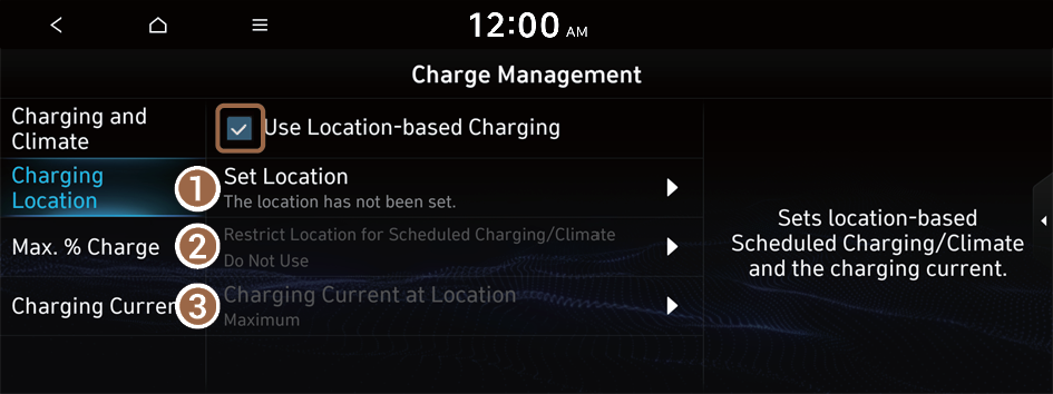 You can set to use the scheduled charging and climate controls only in specific locations and select the current type to use while charging.