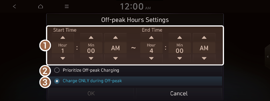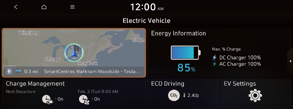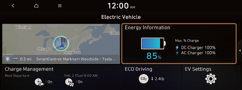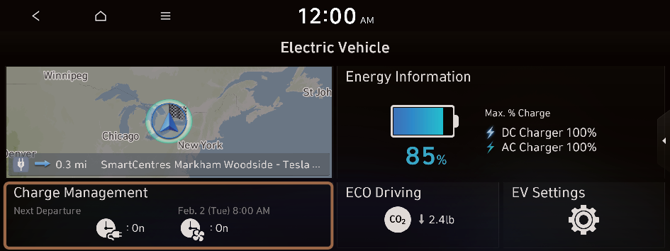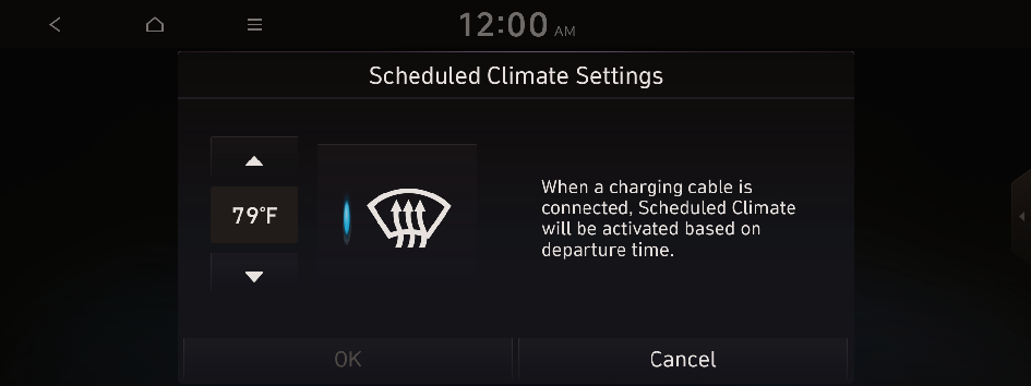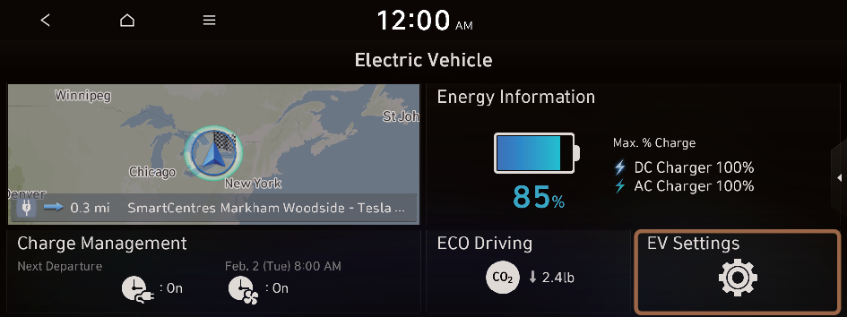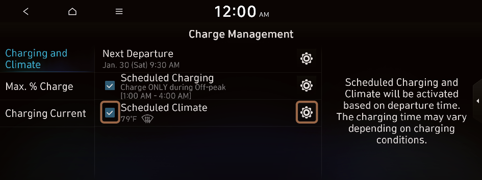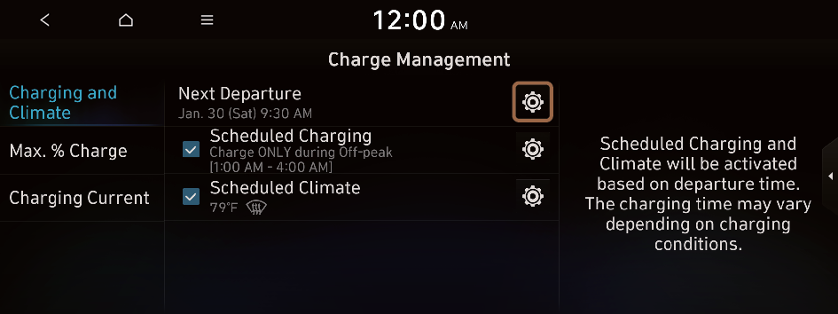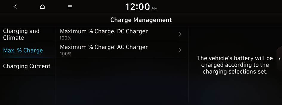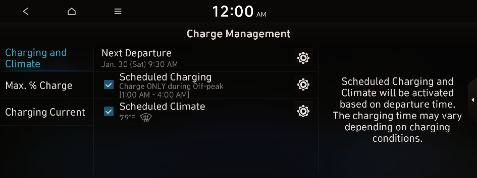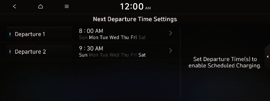 to move to the setting screen for the target AC charging battery level.You can configure various features such as scheduling battery charge and climate controls according to the preset departure time.