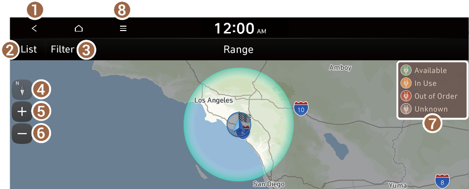 The drivable range is distinguished by a blue circle. Using the icons within the drivable range, you can check the locations and availabilities of charging stations.