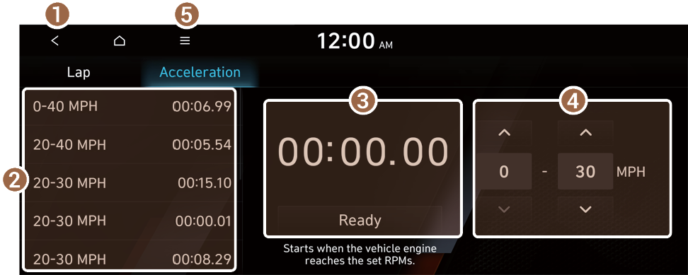On the All Menus screen, press N Mode ▶ Lap Timer ▶ Acceleration.