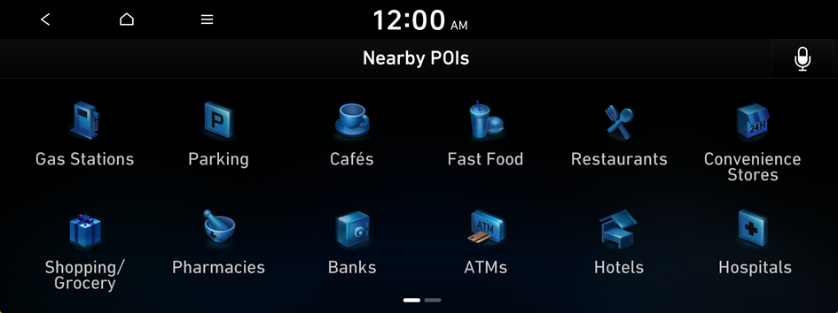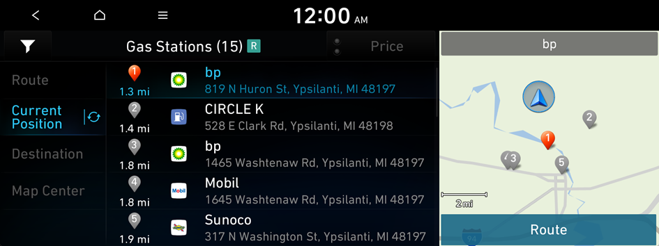 - On the Navigation Menu screen, press Nearby POIs ▶ Gas Stations.