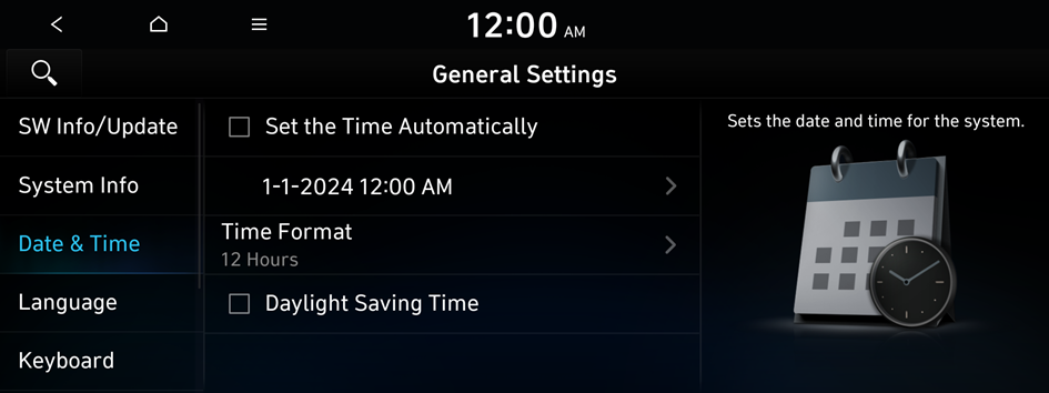 You can set the system date and time automatically or manually. You can also set the time display mode.