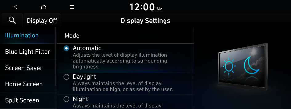 and enter a keyword to search for a setting item. You can also search for a setting item by voice.You can set the system brightness to be adjusted according to the ambient lighting conditions or set the screen to stay bright or dimmed. You can also set to automatically adjust the display brightness depending on the cluster illumination.