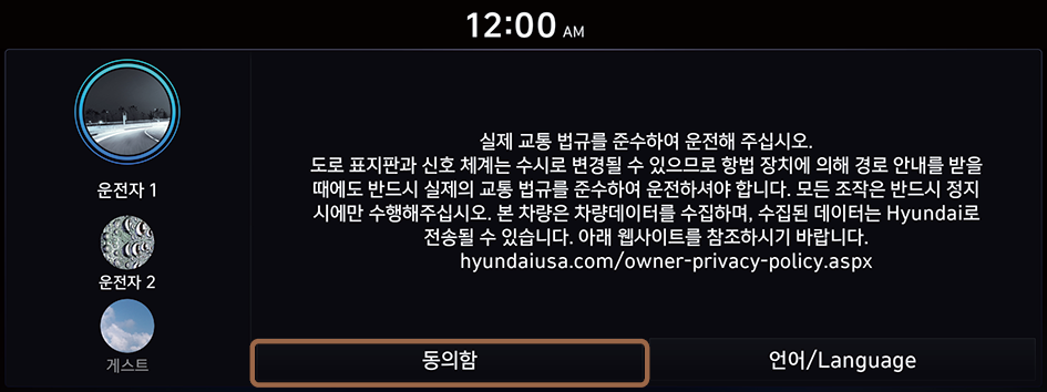 - 안전 경고문이 나타나면 내용을 읽고, 설정하려는 운전자 이미지를 선택한 후 동의함을 누르세요.