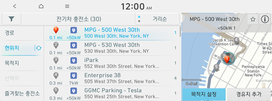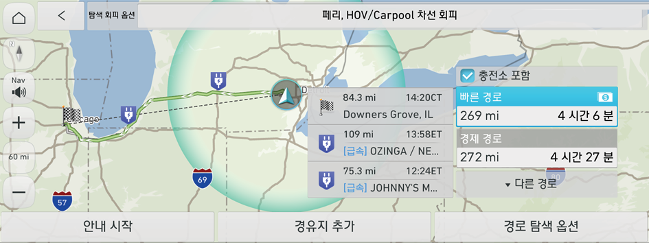 주행 가능 거리 밖의 지역으로 이동해야 하는 경우, 주행 가능 거리 내에서 충전소를 검색한 후 길 안내 기능을 사용할 수 있습니다.