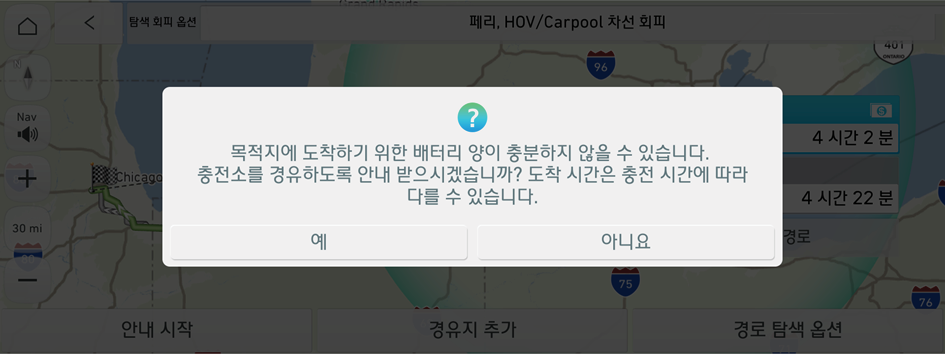 차량의 배터리가 부족하여 경유지 또는 목적지까지 도착이 어려운 경우, 충전소를 경유하는 경로로 안내합니다.