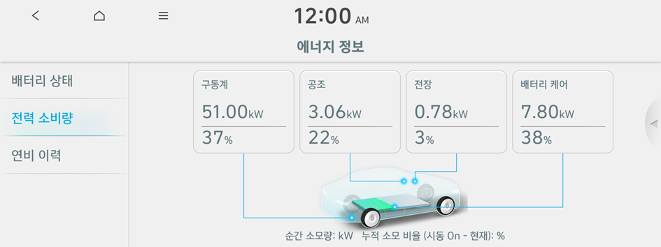 구동계, 공조, 전장, 배터리 케어 기능의 전력 소비량을 확인할 수 있습니다.