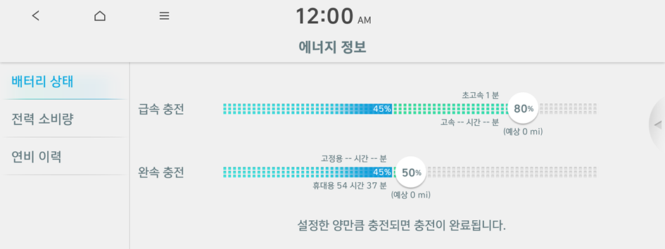 (주행 방향 3D): 주행 방향에 따라 지도 화면을 회전해서 입체적으로 볼 수 있습니다.주행 가능 거리, 충전 시 예상 시간, 연비 그래프, 전력 소비량 등을 확인할 수 있습니다.