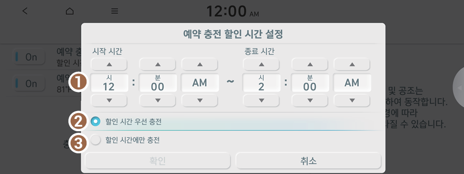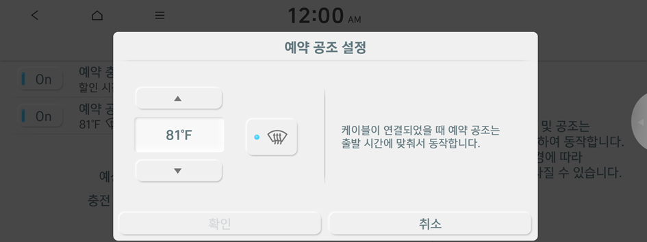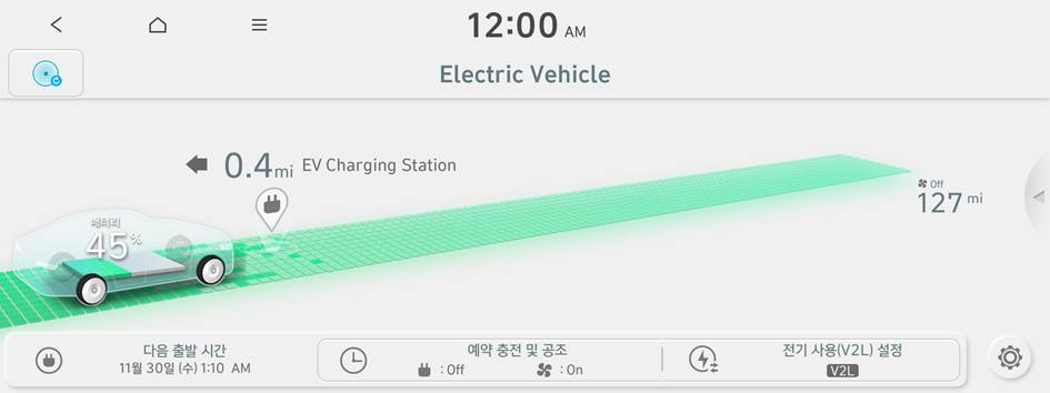 겨울철에 예약 충전 또는 예약 공조 기능을 사용하는 경우, 배터리 온도를 미리 올려 충전 및 주행 성능을 향상시킬 수 있습니다. 해당 기능을 사용하면 배터리를 소모하게 되어, 주행거리가 짧아질 수 있습니다.
