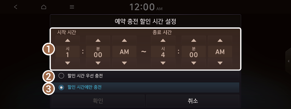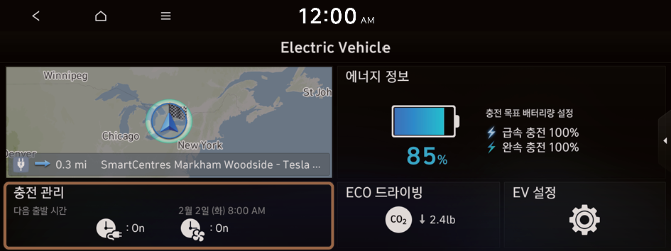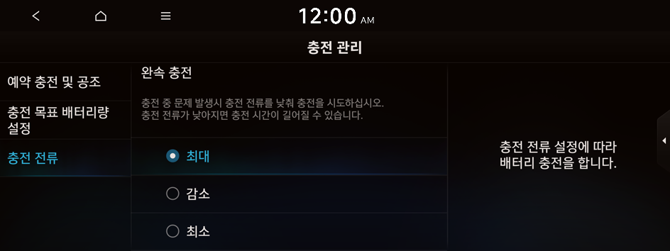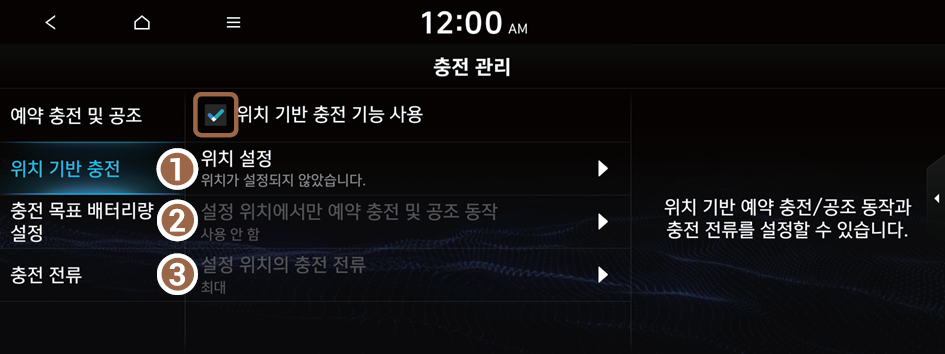 특정 위치에서만 예약 충전과 예약 공조 기능을 사용할 수 있게 설정할 수 있으며, 충전 시 사용할 전류를 선택할 수 있습니다.