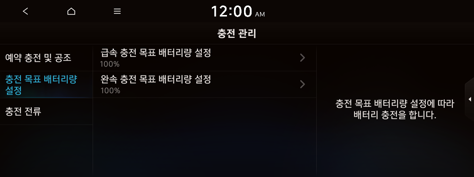 을 누르면 급속 충전 목표 배터리량 설정 화면으로 이동합니다.(사양 적용 시)