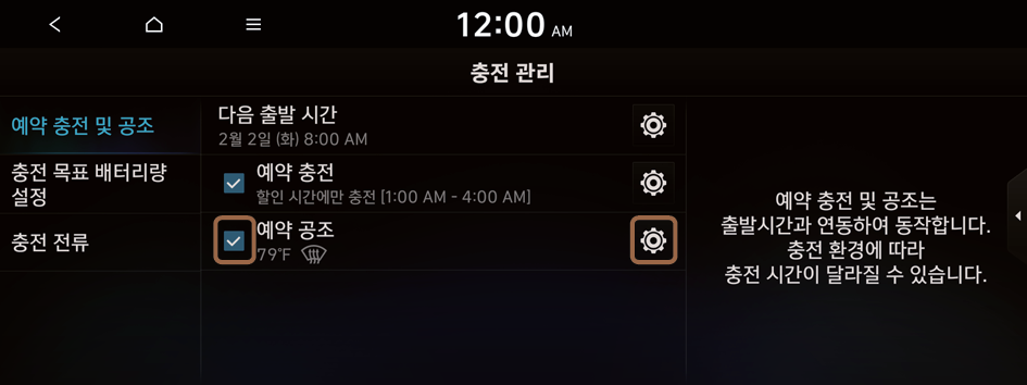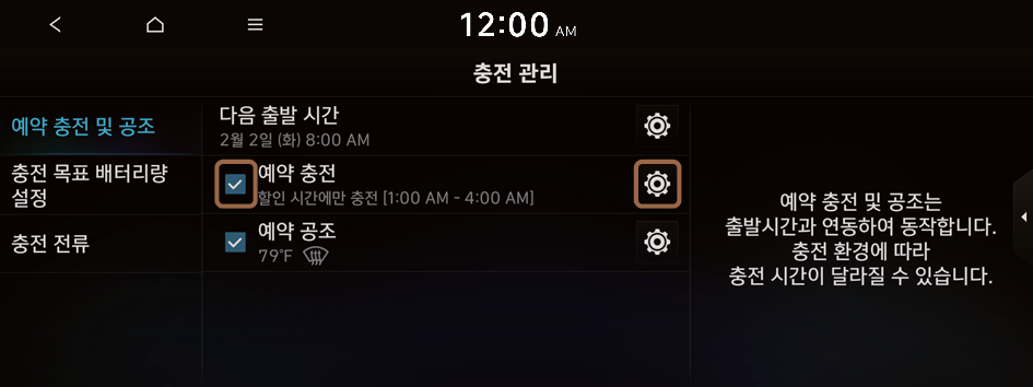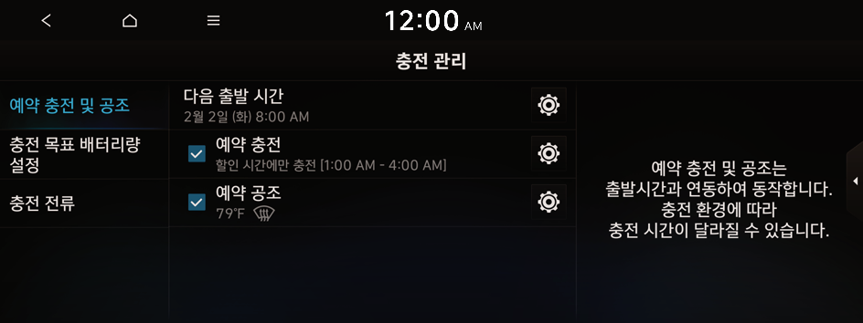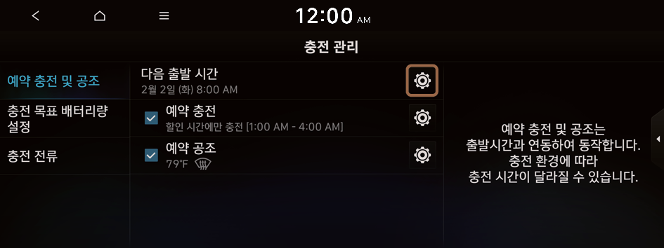예약 충전 및 공조를 다음 출발 시간과 연동하여 설정할 수 있습니다.