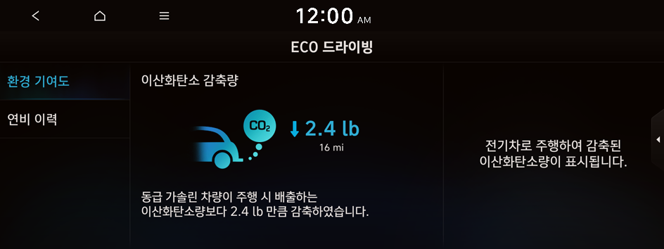 가솔린 차량 운행 시와 대비하여 이산화탄소 감축량을 확인할 수 있습니다.