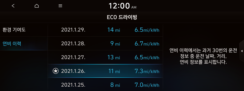 과거 주행 이력에 대한 주행 날짜와 주행 거리, 평균 연비 정보(EV)를 확인할 수 있습니다.