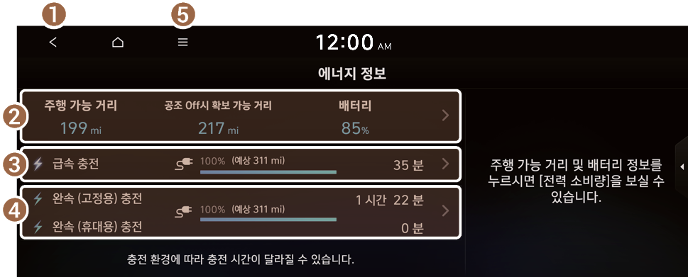 주행 가능 거리 및 충전 시 예상 시간을 확인할 수 있습니다.