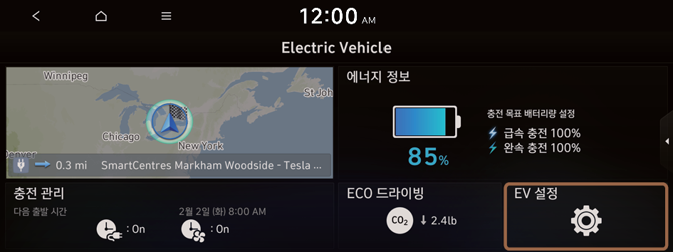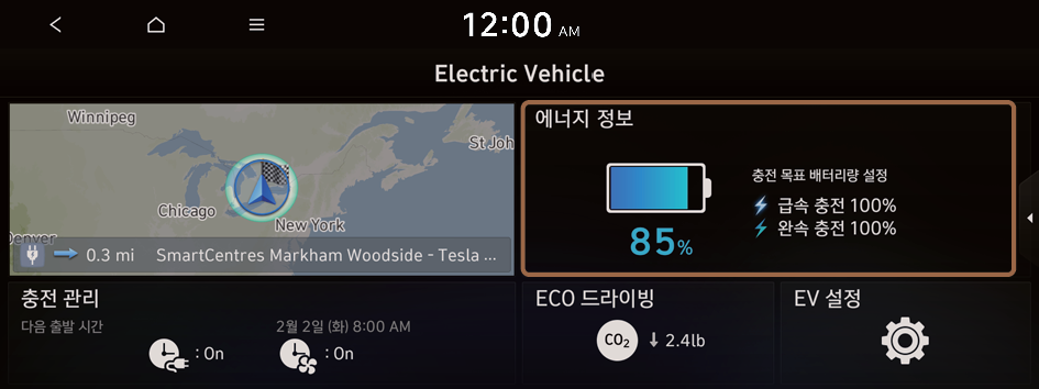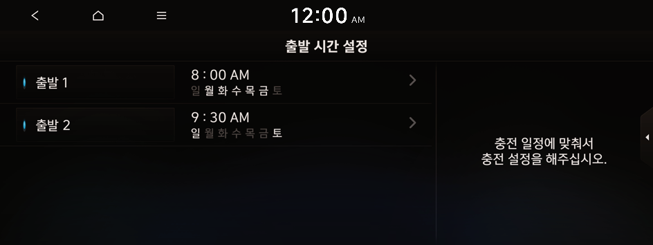 을 누르면 완속 충전 목표 배터리량 설정 화면으로 이동합니다.사용자가 설정한 출발 시간에 맞춰 자동으로 배터리를 충전하거나 실내 온도를 조절하는 등, 다양한 기능을 설정할 수 있습니다.