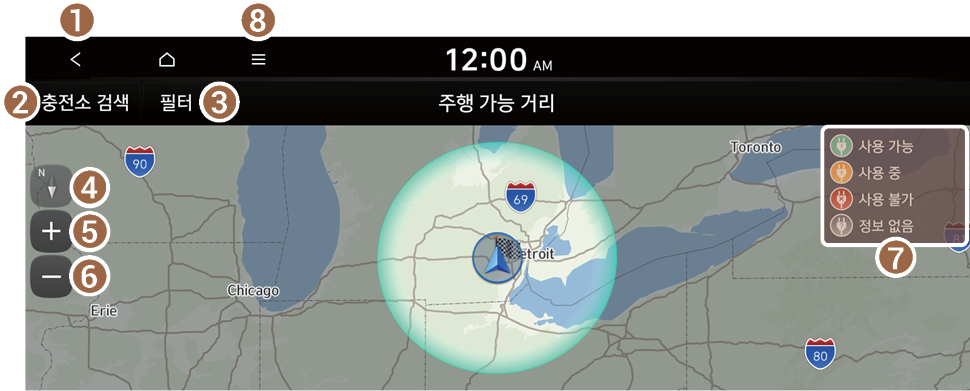 주행 가능 거리에 해당하는 영역이 청록색 원으로 표시되며, 주행 가능 거리 영역 안에 표시된 아이콘을 통해 주행 가능 거리 내에 있는 충전소의 위치와 사용 가능 여부를 확인할 수 있습니다.