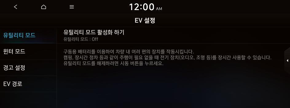 ▶ 연비 이력 삭제를 누르세요.배터리 잔량이 적어 목적지까지 주행할 수 없을 경우 경고 메시지를 표시하도록 설정하거나 현재 배터리 잔량으로 주행할 수 있는 거리를 확인할 수 있습니다. 겨울철에 배터리 온도를 미리 예열하도록 설정할 수 있습니다.