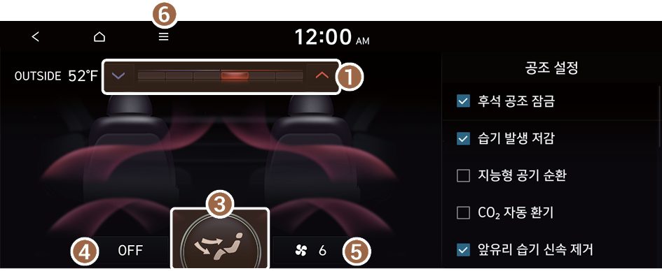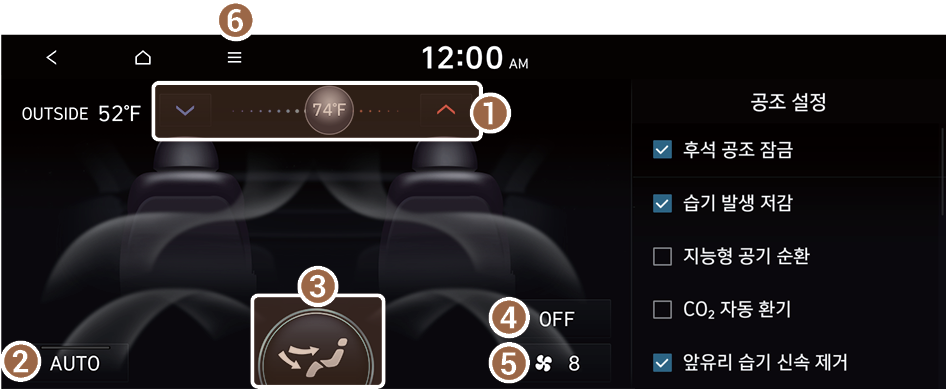 - • 후석 열선/통풍: 후석 열선/통풍 설정 화면으로 이동합니다.(사양 적용 시)