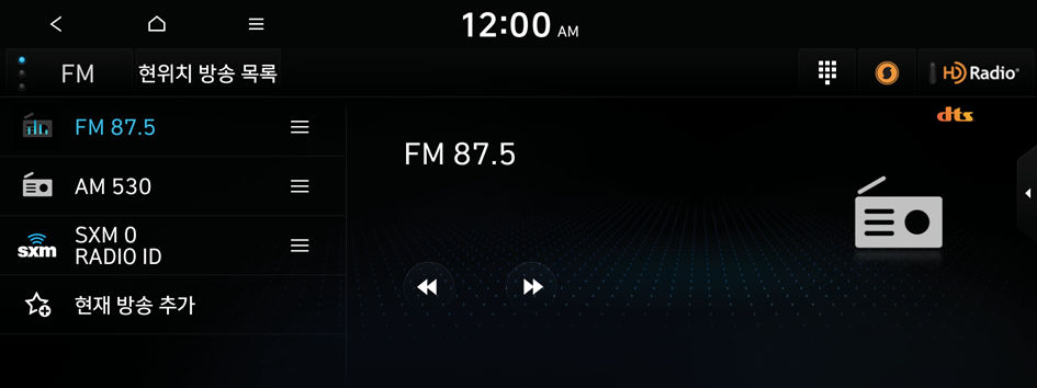 을 누르면 해당 채널의 방송은 차량의 시동을 걸 때마다 자동으로 버퍼링 되므로 청취중에 탐색 기능을 사용할 수 있습니다.(사양 적용 시)