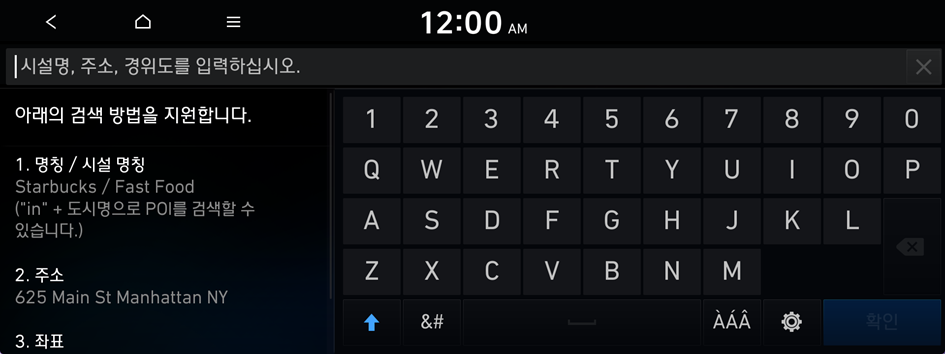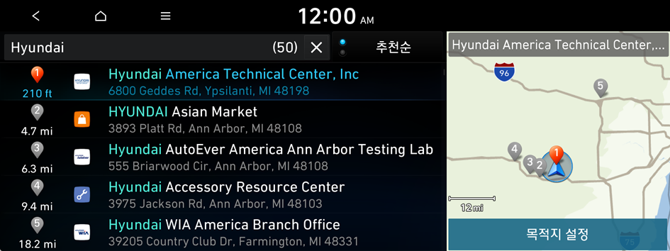 이름, 주소, 전화번호, 좌표 위치 등 다양한 검색어를 입력한 후 검색 결과에서 목적지를 찾아 설정할 수 있습니다.