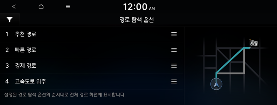 을 길게 누른 후 원하는 위치로 드래그하면 옵션 적용 우선 순위를 변경할 수 있습니다. 회피 경로 옵션을 선택하려면