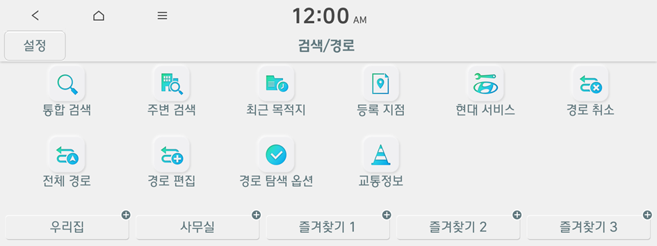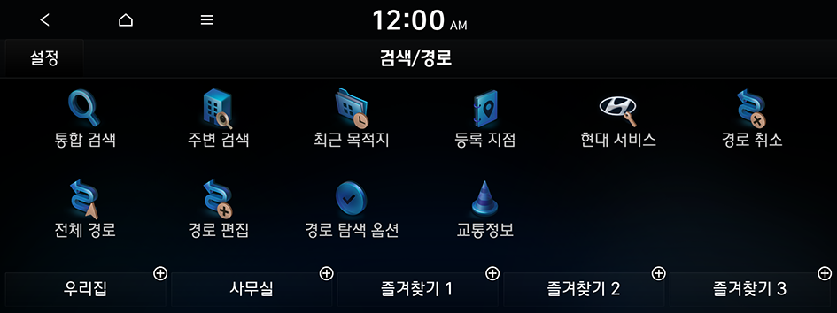 검색/경로 메뉴에서는 위치 정보를 직접 입력해 검색하거나 카테고리별로 분류된 장소 또는 최근 사용한 목적지를 선택하는 등, 보다 다양한 검색 방법을 이용해 목적지를 설정할 수 있습니다.