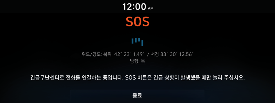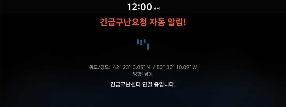 이 서비스는 사고가 발생하고 에어백이 펼쳐지면 즉각적인 지원을 제공합니다. 이 경우, 고객과 현재 위치를 포함해 긴급 구난 알림 신호를 자동으로 블루링크 센터로 전송합니다.