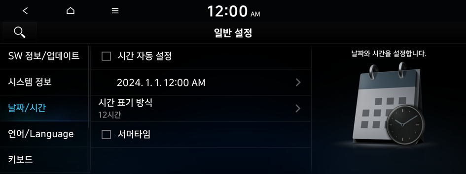 시스템의 현재 날짜와 시간을 자동 또는 수동으로 설정하거나 시간을 표시하는 방식을 설정할 수 있습니다.