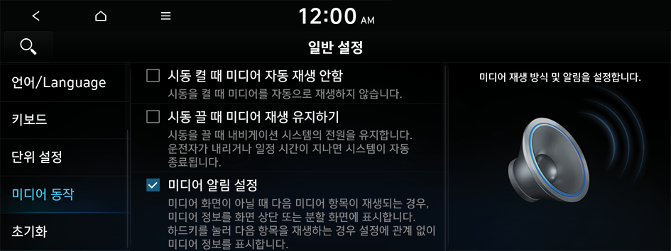 시동을 켰을 때 미디어가 자동으로 재생되지 않도록 설정하거나 미디어 재생 중 정보 변경 시 알림 기능을 선택할 수 있습니다.