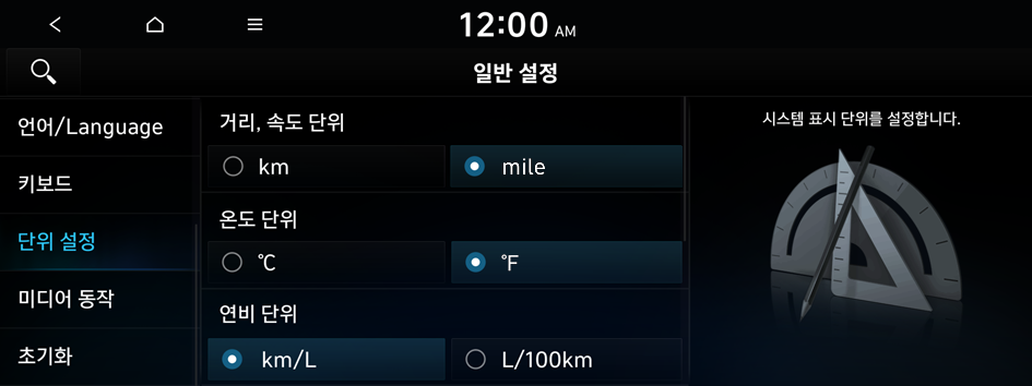 시스템 화면에 표시할 연비 단위를 선택할 수 있습니다.