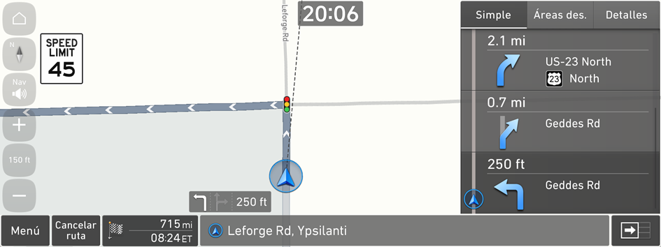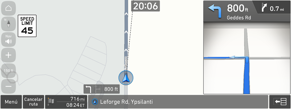 .Para cancelar la guía de ruta, presione Cancelar ruta. De lo contrario, presione Menú Navegación ▶ Cancelar ruta en la pantalla de Todos los menús.