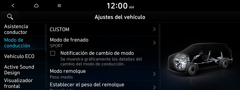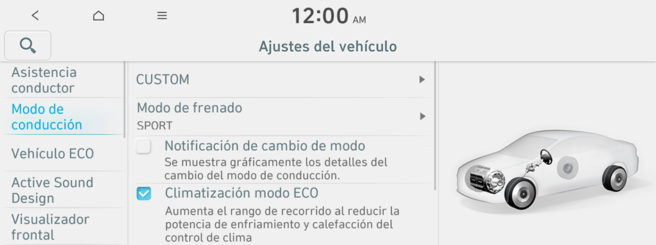Establezca la configuración para que la notificación de cambio de modo de conducción aparezca con la imagen del vehículo cuando se cambie el modo de conducción.