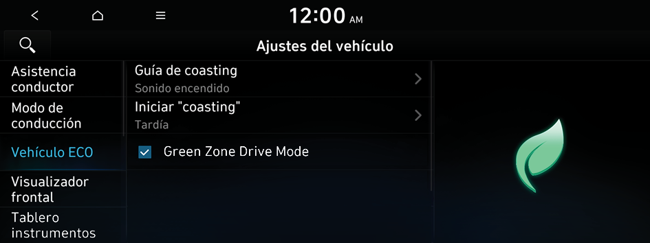 Se trata de un modo de conducción para aumentar el ahorro de combustible del vehículo. Puede cambiar el modo de control de climatización, el nivel de regeneración de energía en "Coasting" activo y los ajustes del límite de velocidad.