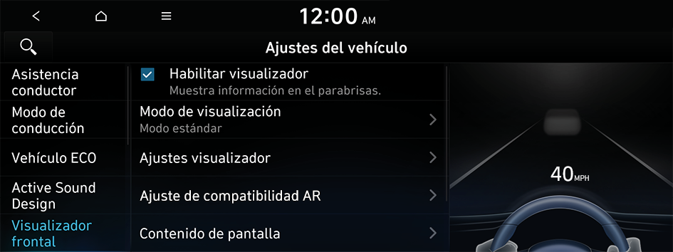 Puede configurar el uso de la pantalla superior frontal que muestra información como la velocidad de conducción y la información relacionada con la carretera mientras conduce.