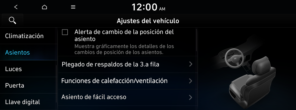 Puede configurar el uso de varias funciones (controles de movimiento y de calefacción del asiento del conductor, del asiento trasero y del volante) relacionadas con los asientos y el volante.