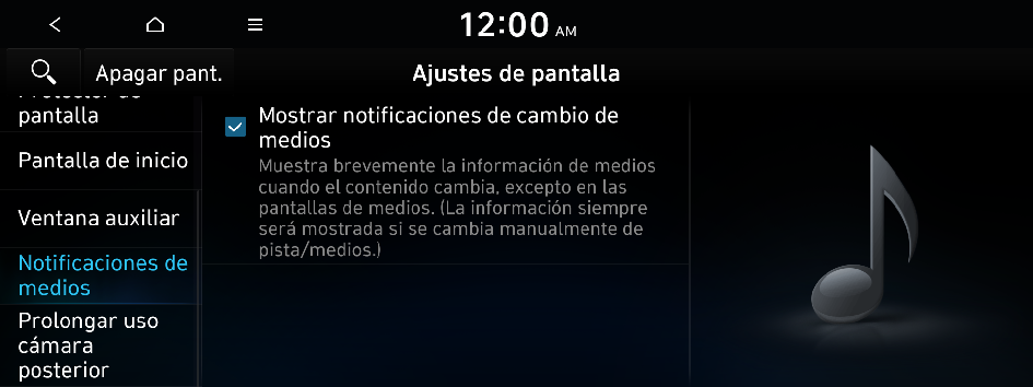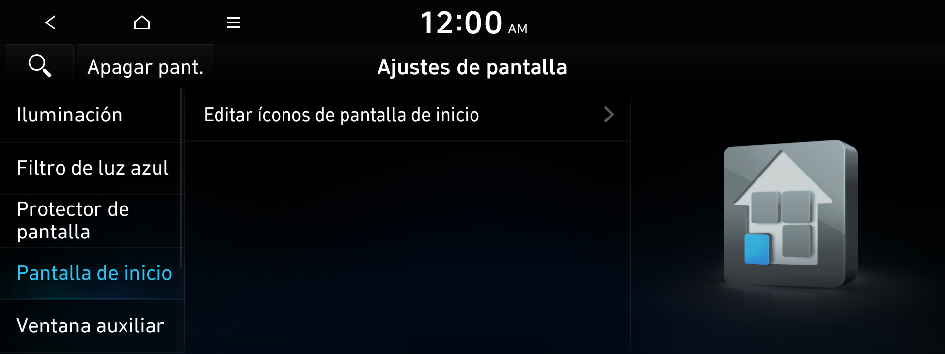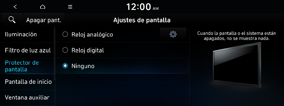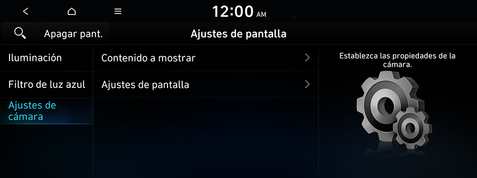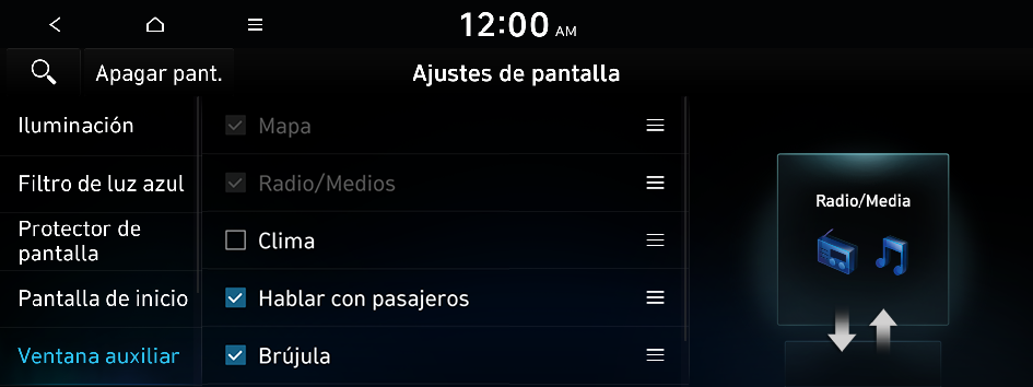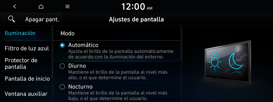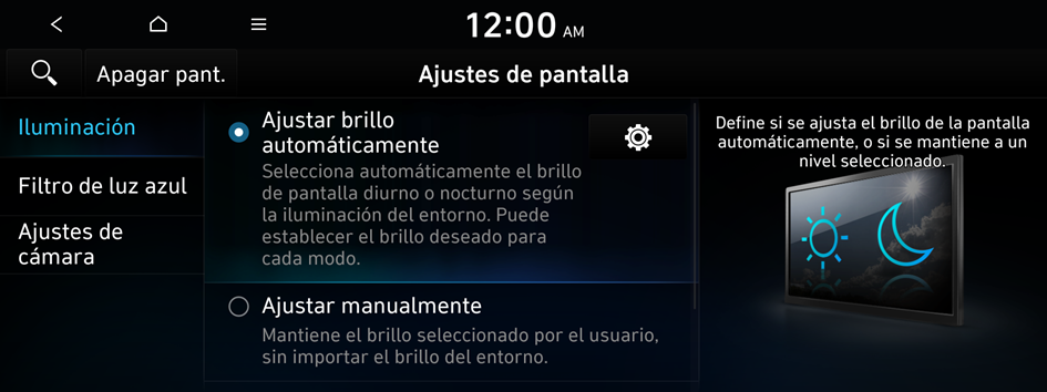 e ingrese una palabra clave para buscar un elemento de ajuste. También puede buscar un elemento de ajuste por voz.Puede establecer que el brillo del sistema se ajuste en función de las condiciones de iluminación del ambiente o que la pantalla permanezca brillante u oscura. Puede establecer que el brillo de la pantalla se ajuste automáticamente en función de la iluminación del tablero.