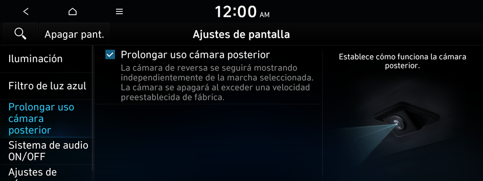 Puede configurar que se muestre el Pantalla de la cámara trasera incluso si cambia la posición de la palanca de velocidades a otra posición que no sea "R" (Reversa) después de hacer marcha atrás.