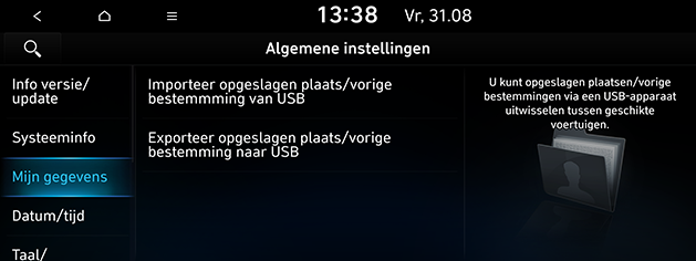 - [Exporteer opgeslagen plaats/vorige bestemming naar USB]: Deze functie wordt gebruikt om het adresboek en vorige bestemmingen van het navigatiesysteem naar het USB-apparaat te exporteren.