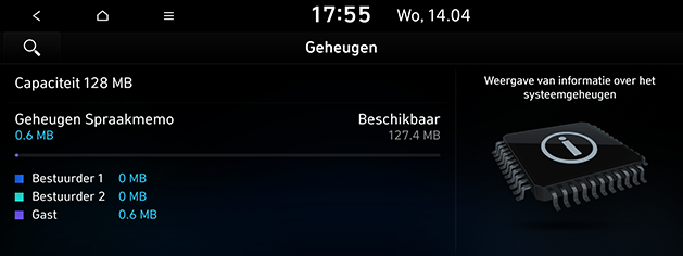 U kunt een geheugenruimte voor spraakmemo controleren (Totale opslagruimte, gebruikte geheugenruimte, resterende geheugenruimte).