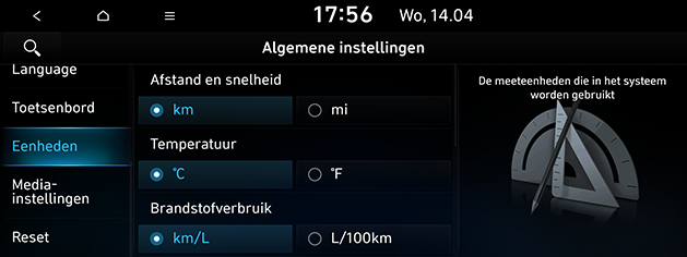 Dit menu wordt gebruikt om de eenheden in te stellen die op het systeem worden weergegeven.