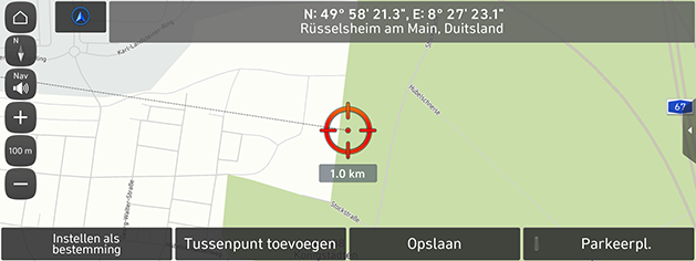 Druk op de kaart en houd het punt op de kaart ingedrukt om het in de gewenste richting te verplaatsen en laat los wanneer het gewenste punt is geselecteerd. Het geselecteerde punt wordt midden in het scherm geplaatst en het scroll vinkje wordt weergegeven. Informatie betreffende het gemarkeerde punt en de afstand in vogelvlucht vanaf de huidige positie wordt weergegeven in het midden van het scherm.