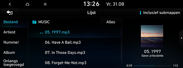 De categorie kan gesorteerd worden op [Bestand], [Artiest], [Nummer], [Album] of [Onlangs toegevoegd].