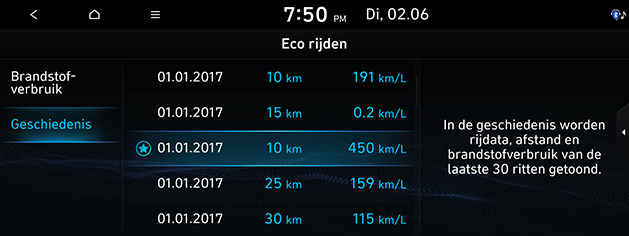 Dit geeft de datum, afstand en brandstofzuinigheid van de vorige rij-historiek weer.