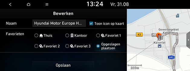 - Als u de positie aan het menu [Opgeslagen plaatsen] wilt toevoegen, drukt u op [Opslaan]. Voor meer details lees het gedeelte “De huidige positie toevoegen aan opgeslagen plaatsen”.