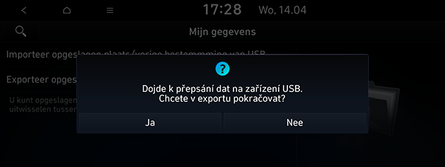 - Druk op [SETUP] > [Navigatie] > [Overige inst.] > [Mijn gegevens] > [Exporteer opgeslagen plaats/vorige bestemming naar USB].