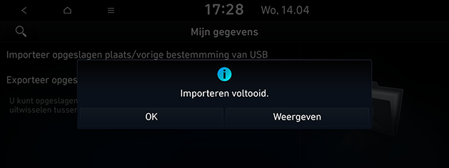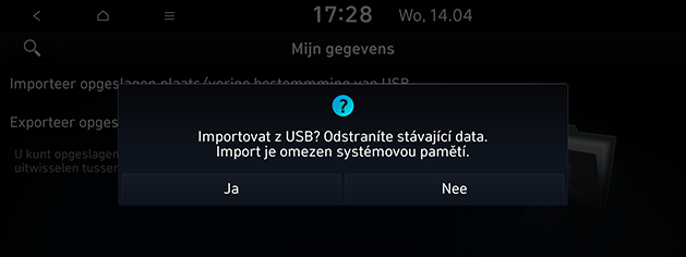 - Druk op [SETUP] > [Navigatie] > [Overige inst.] > [Mijn gegevens] > [Importeer opgeslagen plaats/vorige bestemmming van USB].
