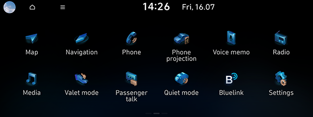 - [Bluelink (If equipped)]: Moves to the [Bluelink] menu.
