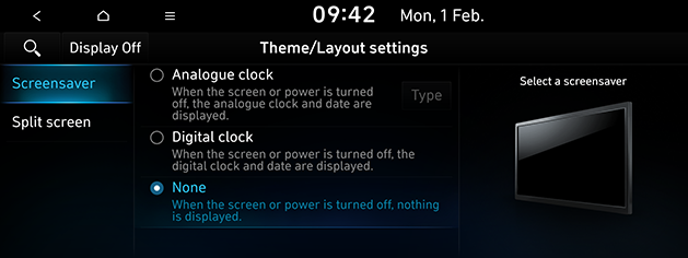 - [Screensaver]: Selects a screensaver. You can select [Analogue clock], [Digital clock] or [None] for screensaver display.