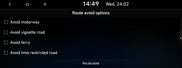 - [Avoid motorway], [Avoid vignette road], [Avoid ferry], [Avoid time restricted road], [Avoid toll road], [Avoid tunnel]: Check or uncheck the desired items and press [Recalculate]. The route is set regarding the option.